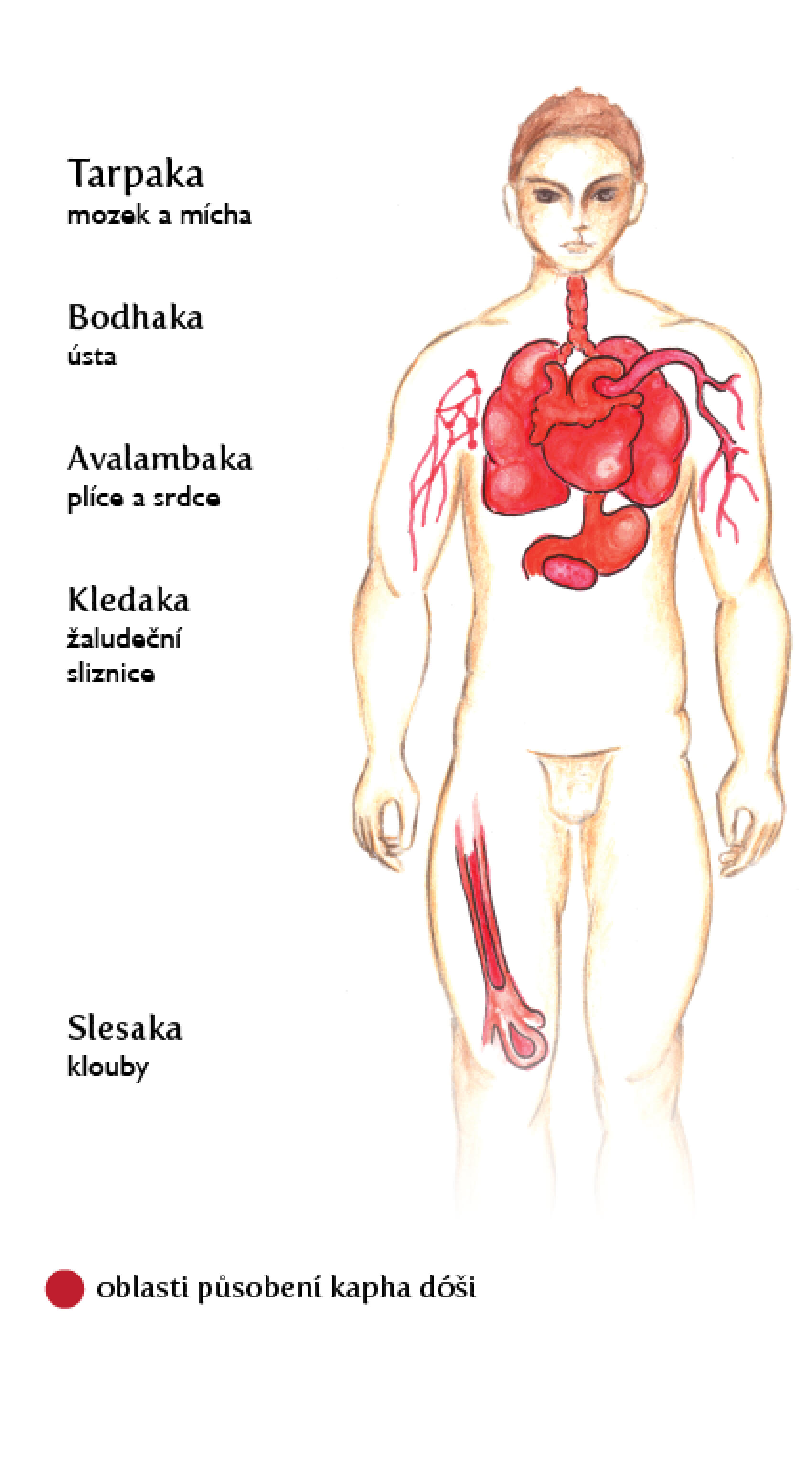 Hlavnými oblasťami tejto dóše v ľudskom tele sú: hruď, pľúca, žalúdok, pankreas, lymfatické uzliny, kĺby, plazma, tukové tkanivo, biela hmota mozgová, ústa, hrdlo, nosné a čelné dutiny spolu s čuchovým a chuťovým zmyslom. Princíp kapha je v pozadí regenerácie buniek a tkanív, procese hojenia rán, tvorby kĺbového maziva a dobrej fyzickej kondície. Narušenie tejto dóše prináša pocit pohodlnosti, lenivosti, ľahostajnosti, pasivity, ľahostajnosti, lipnutí a depresie.