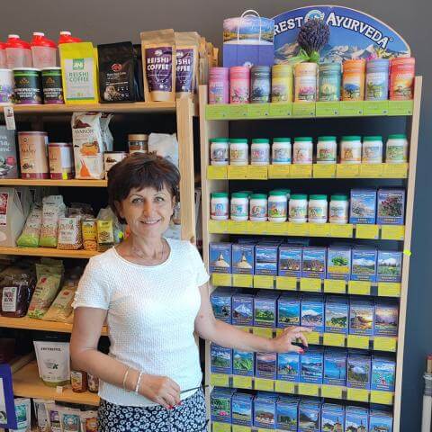 Drevený brezový stojan pre ajurvédske čaje a ľahký farebný kartónový stojan pre ostatné prípravky umožňujú prehľadnú prezentáciu celého sortimentu na jednom mieste. Stojany zapožičiavame zadarmo - zákazník má možnosť ľahko si vybrať a zorientovať sa v ponuke.